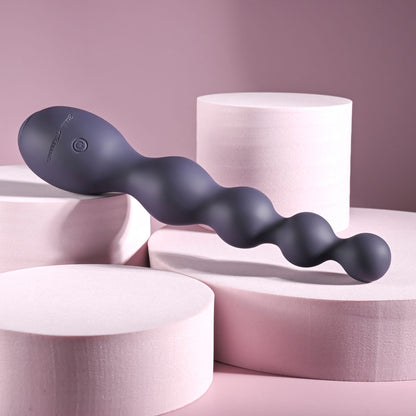 Experience a blissfully bumpy ride with this powerful beaded vibrator that features graduated bulbs on a flexible shaft, leading from the smallest easy-entry round ball tip all the way to the chunky oval-handled base and its simple 1-button control.